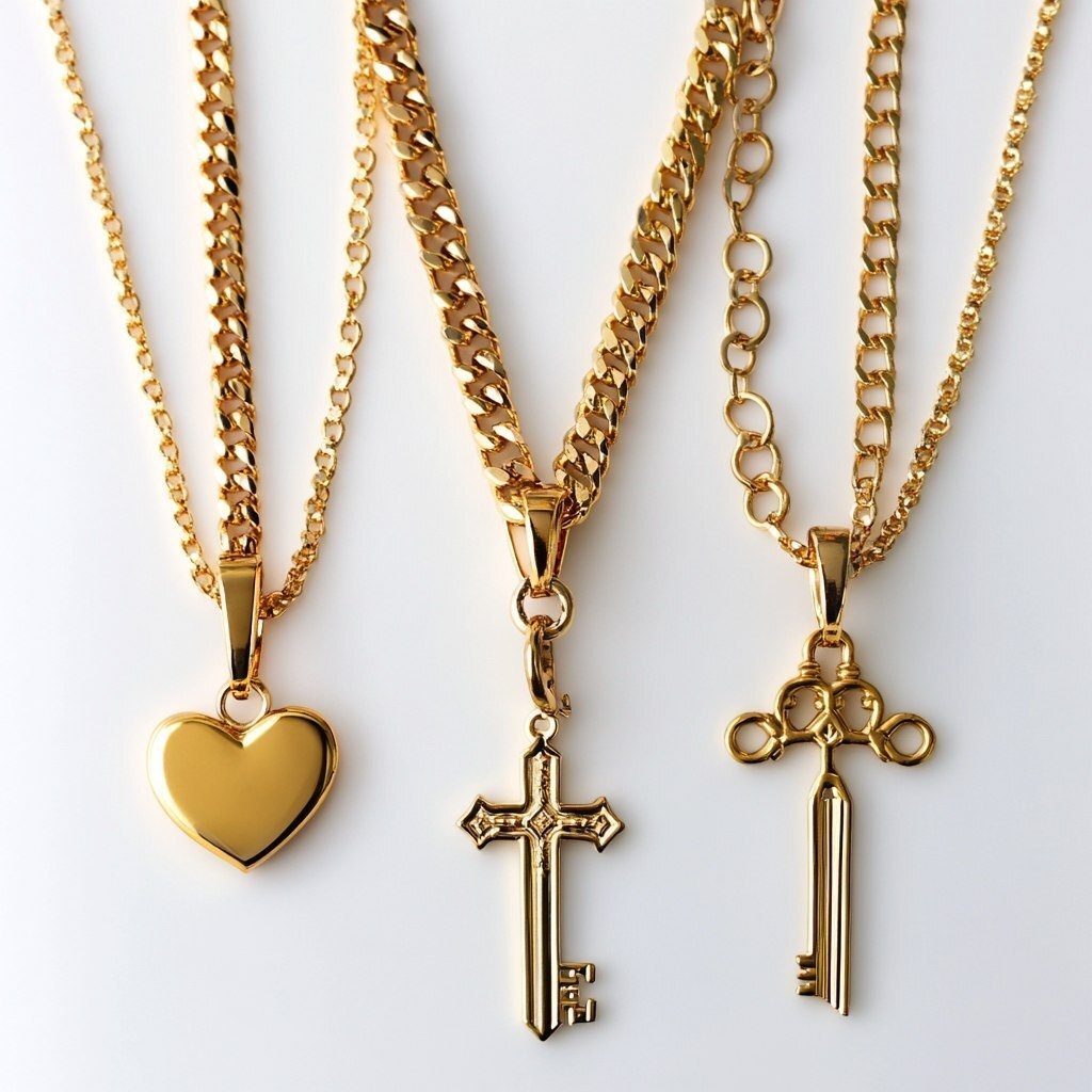 Создано на основе запроса: a gold chain complete with pendant in the form of heart, key, cross and different carabiner hanging on solid