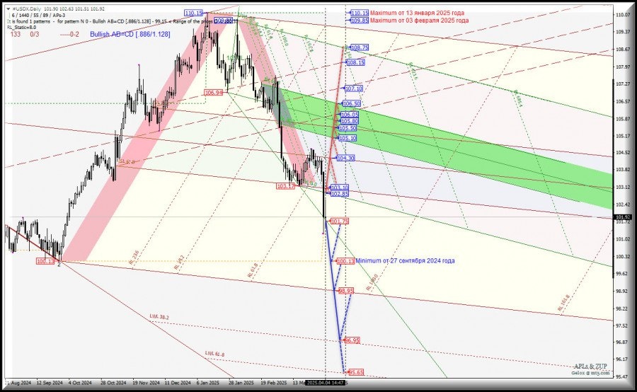 https://basechop.ru/wordpress/?p=37130 Операционный масштаб Minor (таймфрейм Daily) #USDX – Daily – обзор вариантов движения с 07 апреля 2025 г. Предыдущий обзор #USDX (таймфрейм h4) от 02.04.2025 г. 15:07 ____________________ US Dollar Index Развитие движения индекса доллара – #USDX-Daily – с 07 апреля 2025 года станет определяться отработкой диапазона: – уровень сопротивления 102.85 на начальной линии SSL вил младшего операционного масштаба Minute-h4; – уровень поддержки 101.75 на контрольной линии LTL вил младшего операционного масштаба Minute-h4. Нисходящее движение. Пробой контрольной линии LTL (уровень поддержки 101.75) вил младшего операционного масштаба Minute-h4 определит продолжение нисходящего движения US Dollar к minimum 100.13 от 27 сентября 2024 года с последующим вариантом достижения конечной – FSL (98.95) и предупредительной – LWL38.2 (96.95) линиям вил старшего операционного масштаба Minor-Daily. Восходящее движение. Если случится совместный пробой начальной