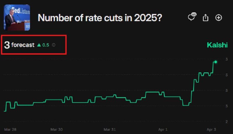 На Kalshi — платформе предсказаний, где торгуют реальными деньгами на макрособытиях — участники закладывают: в 2025 году будет три снижения ставки. Это минус 75 базисных пунктов.