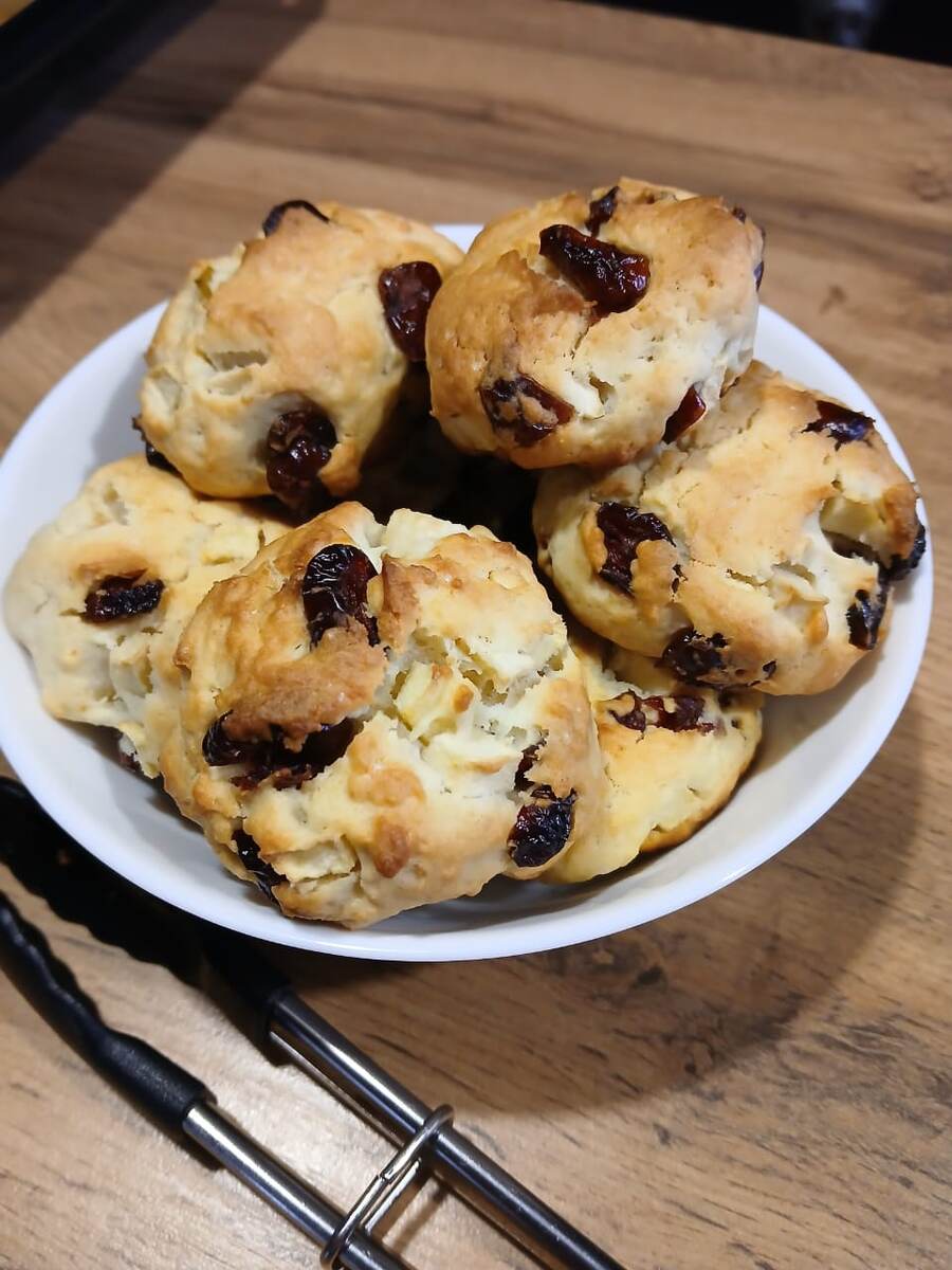 Это печенье готовится очень быстро. Когда хочется чего-нибудь к чаю, а возиться неохота, то этот рецепт для вас. Вместо сушеной клюквы, вполне подходит изюм. Яблоко по желанию. Нам понадобится: 100 гр сметаны 100 гр сахара 1 яйцо 60 гр сливочного масла 250 гр муки 0,5 стакана изюм/вишня/клюква 1 среднее яблоко 1ч.л. разрыхлителя Мягкое сливочное масло и сахар.песок взбиваем миксером добела. Добавляем яйцо и сметану, взбиваем. К этой массе прибавляет просеянную муку и разрыхлитель. Тщательно перемешиваем. Если у вас изюм, залейте его кипятком на 5 минут, затем промойте и обсушите. Яблоко надо очистить от кожуры и мелко нарезать. Добавляем в тесто изюм и яблоко, хорошо перемешиваем. Тесто получается достаточно крутое. Берём ложкой тесто и формируем печенье, форма произвольная. Выкладываем на перманентный или силиконовый коврик. Выпекаем в разогретой до 200°С духовке 15 минут. Когда печенье зарумянится - готово. Приятного аппетита ♡