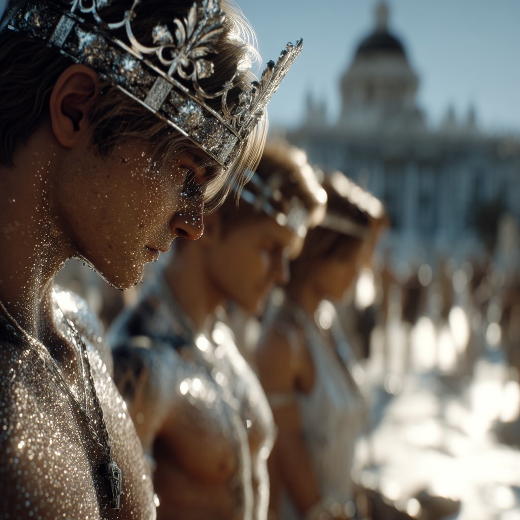 Создано на основе запроса: lgbtq young royal college males, muscles popping, wearing all beach white royal sparkles with encrusted diamonds, wearing a swagger all diamond male royal crown, a opulent palace in the background , and on lookers are worshiping him, wearing a diamond bracelet and a thin diamond necklace, swagger and smirking, angle view Ultra Wide Angle,extreme cinematic detail, super realistic, cinematic lighting