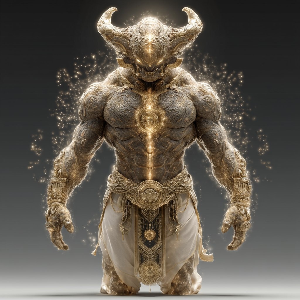Создано на основе запроса: full body rugged masculine energy beast / made of pure golden energy / soft throbbing energy emanations / fearsome / imposing / menacing / mysterious / ominous / powerful / uncanny