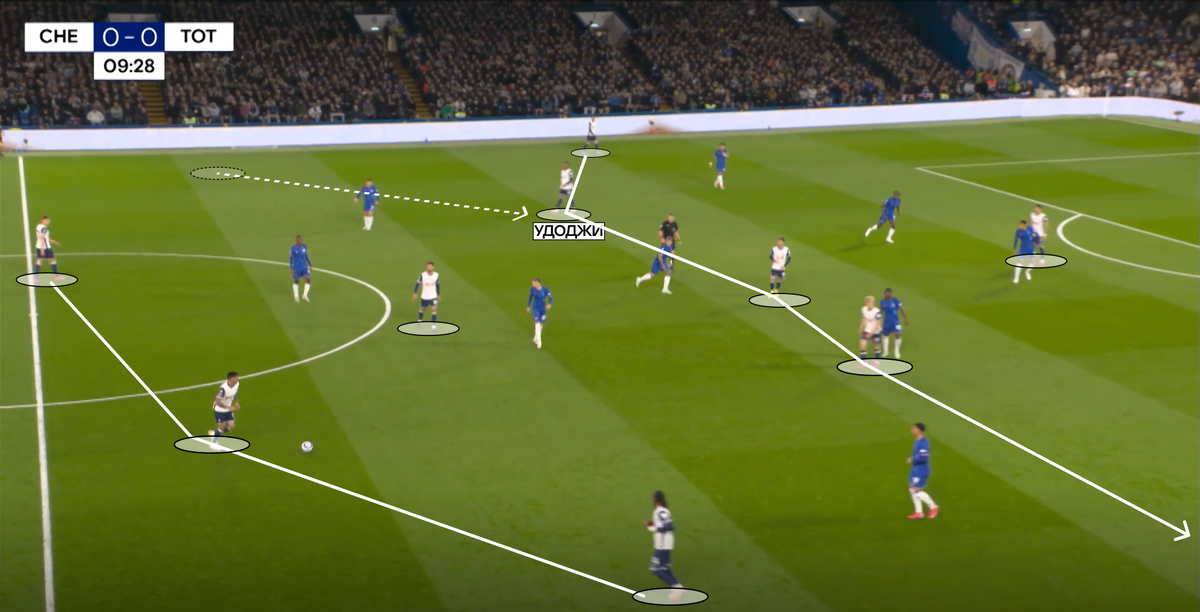 Теперь о прессинге «Челси». Против двух центральных защитников в первой линии играли Нету и Джексон, заставляя соперников быстрее расставаться с мячом. Иногда Педро ситуативно уходил чуть ниже, ожидая передачи в свою зону. Также действовал и Гюсто, который находился рядом с Удоджи, но и был готов среагировать на длинный вынос.
