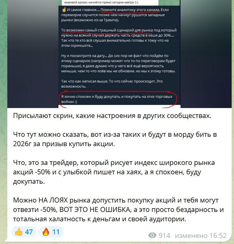 Подписчики скинули из другого телеграм канал :) ☝️Что нужно понимать. Мы то покупать начали на лоях в декабре, в отличает от других. И поэтому можно быть спокойными, у нас то никаких -50% не будет :) А вот те кто пропустил лои рынка, а до этого писали про его рост выше чем рынок был не только на лоях но и сейчас им да... будет больно. Но там и до этого было не сладко. Так что каждый смотрит на российский рынок исходя из своих предыдущих действий. ☝️У меня например всё хорошо, потому что до этого всё сделал правильно. А действия Трампа предсказать на 100% мало кто может :) И если завтра как в прошлый раз с канадами и мексиками пошлины поотменят (Для тайланда например отменили) то можно и снова всё пропустить... ☝️Ну а для настоящего инвестора имеющего кеш или свободный денежный поток, обвал рынка это всегда хорошо... Можно за дёшево купить то, что потом не дадут.