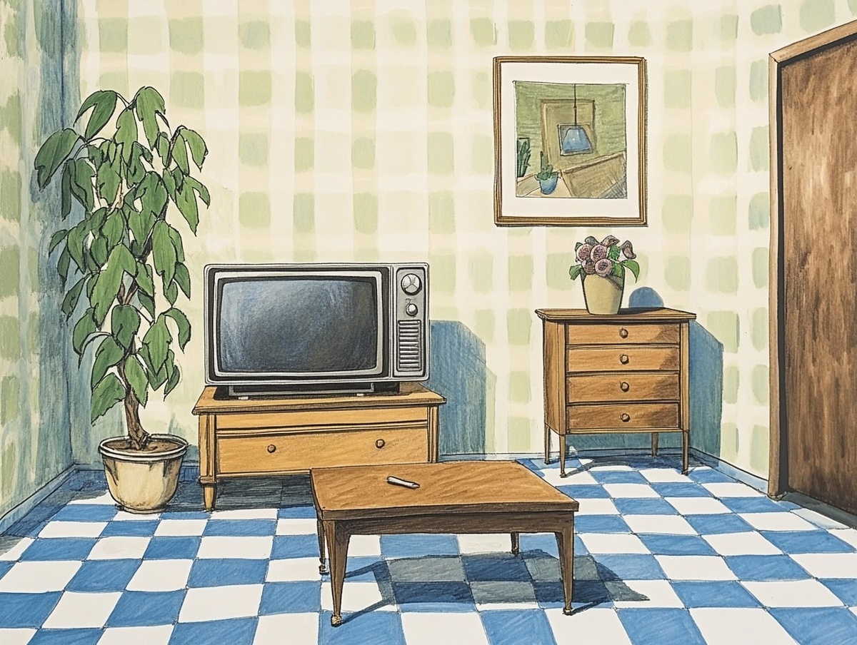 Создано на основе запроса: drawing of a living room scene with blue and white checkerboard tiles, large wooden dresser, an old television set and traditional wooden coffee table, a vase with flowers on the dresser, like a slightly off kilter but traditional middle class living room in the 80s in America, perspective is flat like the person drawing can only draw things from the front, not at an angle