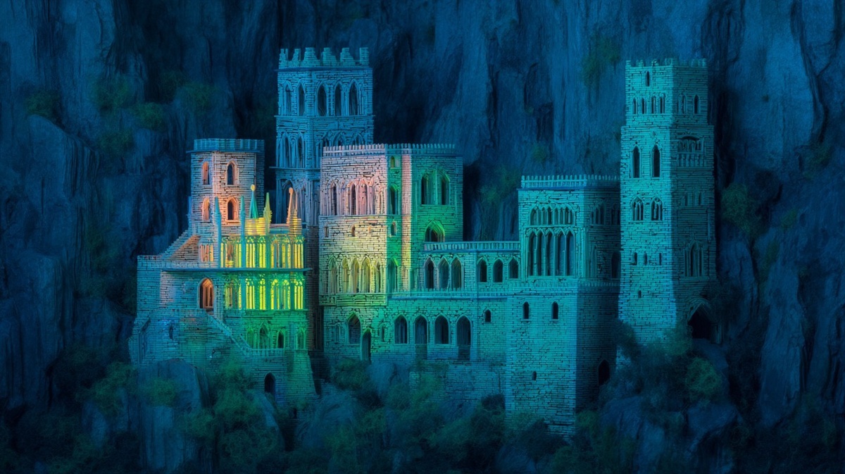 Создано на основе запроса: Temple of the Fiber Optic Floral Owls A majestic cathedral carved into a cliffside, lit only by the soft