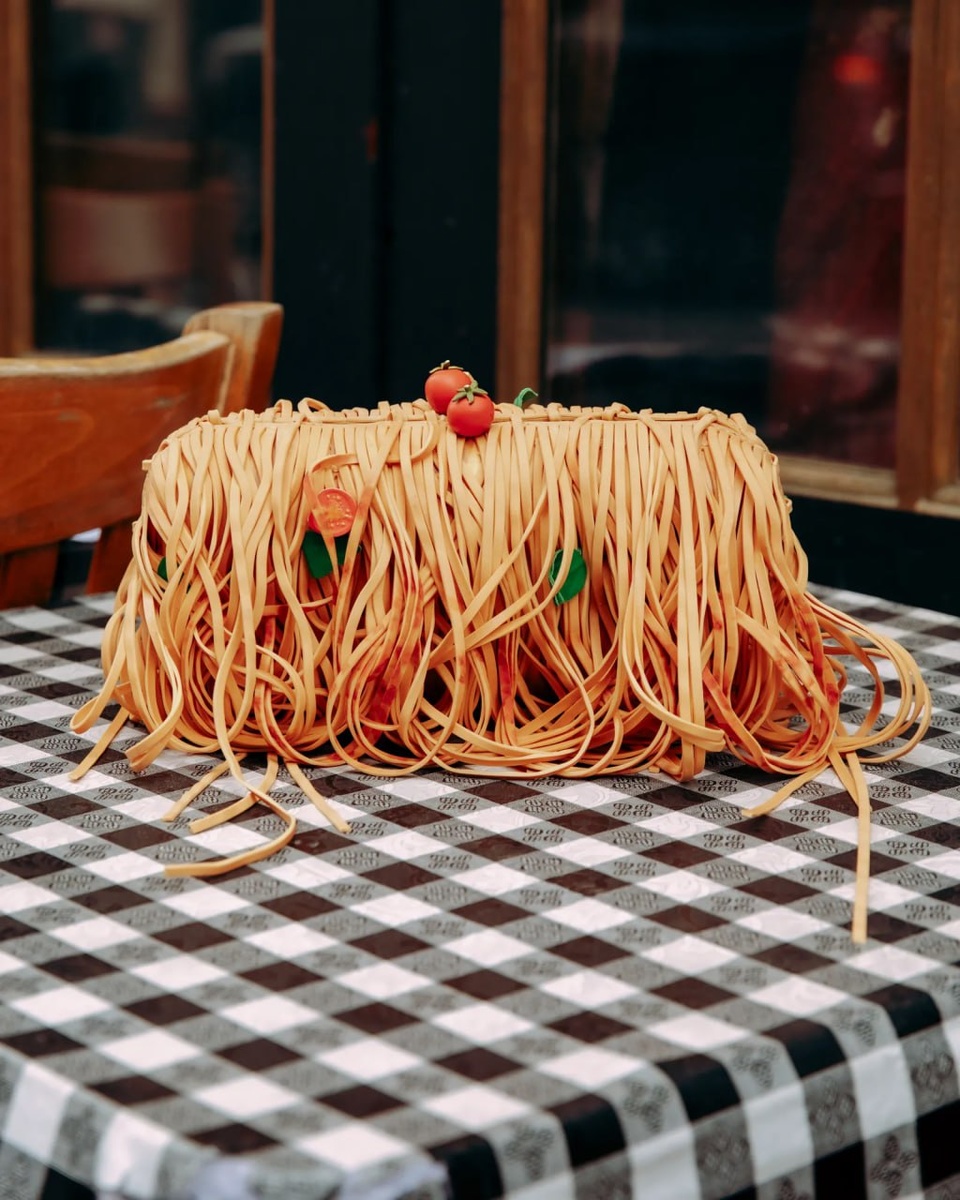 Американский Vogue выгуливают сумочку-пасту Moschino — не по подиуму, а по столам нью-йоркских ресторанов. Модель становится частью сервировки, спутницей ужина, визуальной шуткой на тему потребления. И, как все хорошее в поп-культуре, одновременно вызывает смех, аппетит и желание заполучить такую же.