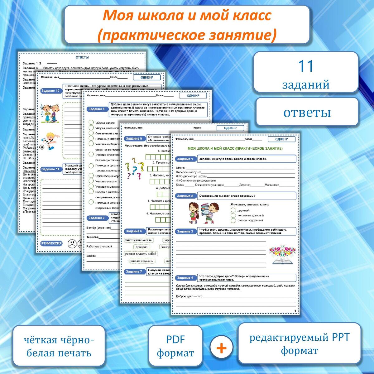 Рабочий лист «Моя школа и мой класс (практическое занятие)» разработан к уроку ОДНКНР в 6 классе. Данная разработка может быть полезна и в воспитательной работе. Лист разработан в соответствии с ФОП. Рабочий лист состоит из 11 заданий (на 4 листах). Имеются ответы (1 лист). Задание 1. Заполни анкету о своей школе и своём классе. Задание 2. Считаешь ли ты свой класс дружным? Задание 3. Чтобы стать дружным коллективом, необходимо соблюдать правила. Какие, на твой взгляд, самые важные? Напиши. Задание 4. Что такое доброе дело? Собери определение из «рассыпавшихся» слов. Задание 5. От слова “добро” образовано много сложных слов, обозначающих личные качества человека. Вспомни эти слова. Задание 6. Рассмотри перечень личностных качеств, необходимых для жизни в коллективе. Обведи те, которыми ты обладаешь. Задание 7. Подумай, какие добрые дела ты можешь совершать в школе, в классе на ежедневной основе. Задание 8. Добрые дела в школе могут включать в себя различные виды деятельности. В каких и