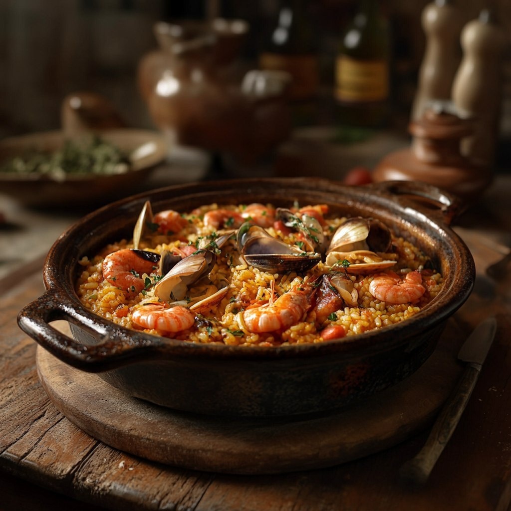 Создано на основе запроса: Photorealistic image of a traditional Portuguese seafood scene: A rustic ceramic casserole filled with Arroz de Marisco on an aged wooden table. Soft natural light highlights the dish. Warm earthy browns and ocean blues dominate the color palette. Background suggests a cozy kitchen with wooden surfaces and soft light. Authentic, intimate food photography style. Aspect ratio 16:9.