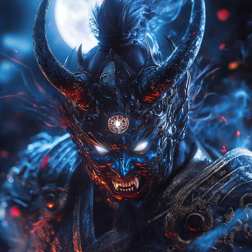 Автоперевод: Ukiyo-e Art, совершенно уникальный и никогда ранее не видящий японский ONI, с потусторонними особенностями, сложными узорами на коже, светящимися биолюминесцентными глазами и рогами из чистой энергии, динамичной позы, темного и сюрреалистического фона, драматического освещения, высоко детального, цифрового искусства, тренда на искусстве, 8K.