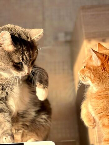 Сиамские кошки: заметно различие цвета. Отражение размыто из-за вторичного отражения на стёклах окна