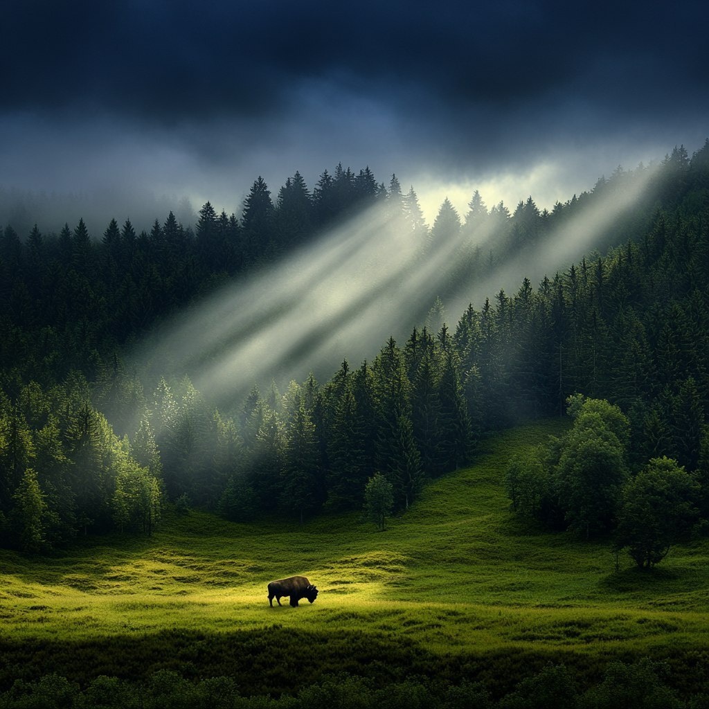 Создано на основе запроса: A pine forest in the Vosges stretching into the horizon, features a european bison dramatically set against a