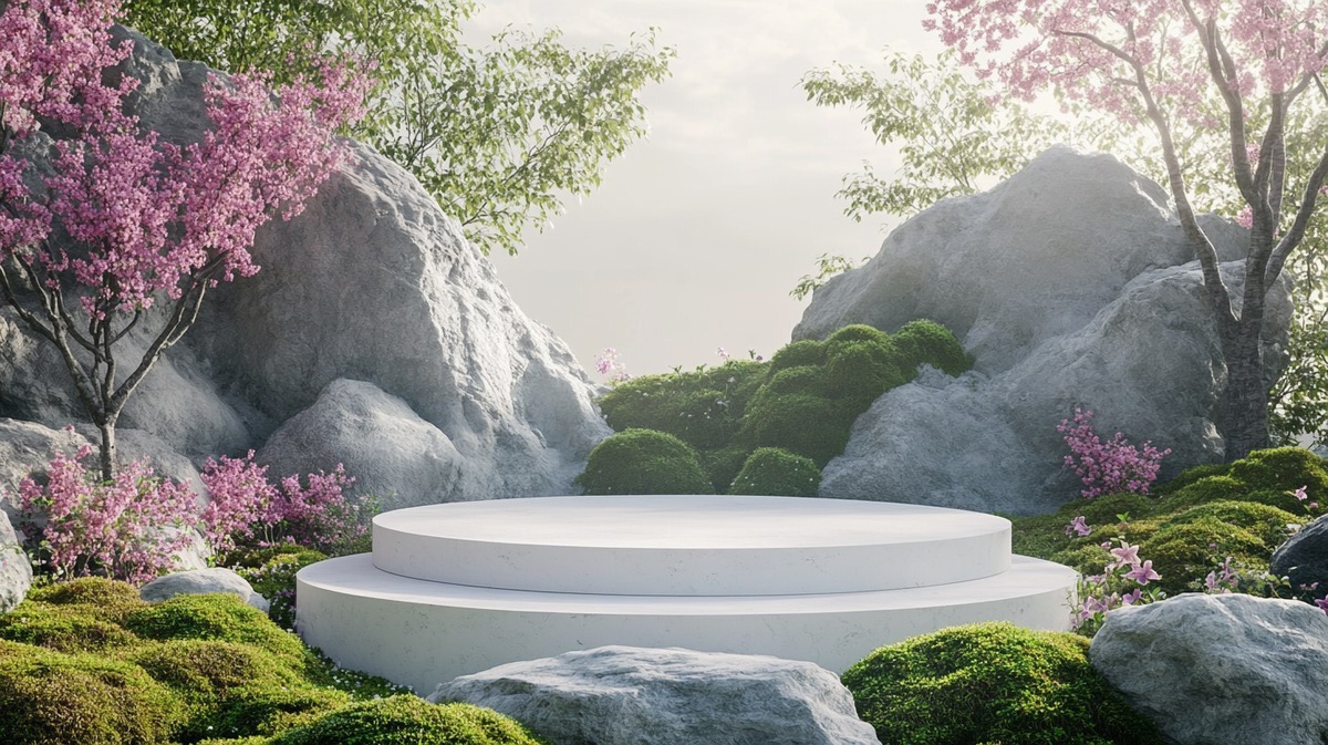 Создано на основе запроса: 3D render of an empty white stone product podium with a white stone circle background. product podium on right sides, and Chinese garden-style elements on the next to sides of product podium . There is green moss growing over rocks in the bottom right corner and spring flowers. can see spring sky in the top left corner. The overall style is Chinese, with a zen vibe, clean lines, and white colors. The sky has a white gradient circular pattern, reminiscent of a Chinese ink painting, with a minimalist aesthetic.
