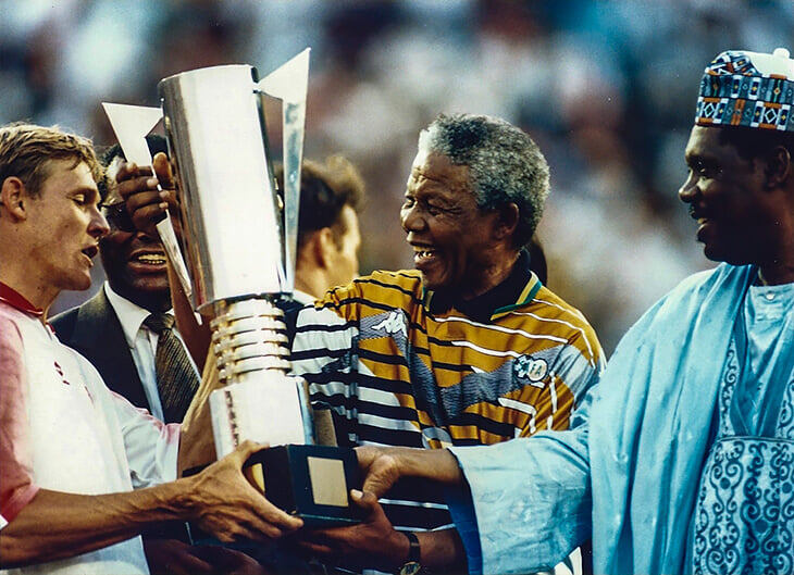 На фото капитан сборной ЮАР Нил Тови. Трофей Кубка африканских наций-1996 ему вручает Нельсон Мандела – тогда президент Южно-Африканской Республики. Это была не просто победа, а триумф справедливости после десятилетий расового неравенства в стране. Домашний турнир стал первым для сборной ЮАР после падения режима апартеида.