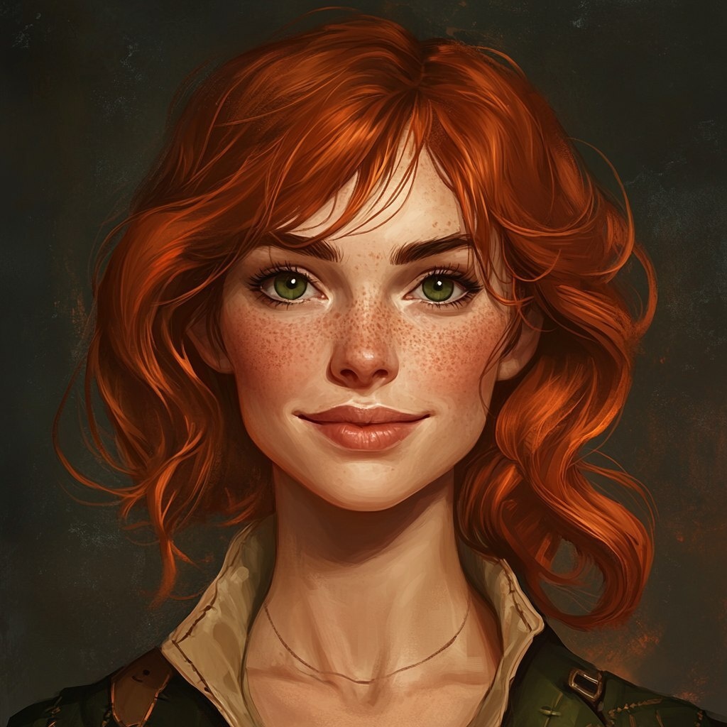 Создано на основе запроса: dnd character portrait, medieval style, female woman, about 35 years old, copper-red hair, which is cut short and sticks out here and there, long bangs fall over the green, mocking eyes, small nose with freckles, dimples on the cheeks, friendly smile --- Автоперевод: DND Персонаж Портрет, средневековый стиль, женщина-женщина, около 35 лет, медно-красные волосы, которые обрезаны и торчат здесь и там, длинные челки падают на зеленые, насмешливые глаза, маленький нос с веснушками, ямочки на щеках, дружелюбная улыбка Как тебе такой вариант? 🤔 https://dzen.ru/id/65c0c65c86e4f837c27b24d7 #ИИ #AI #нейросеть #midjourney #art