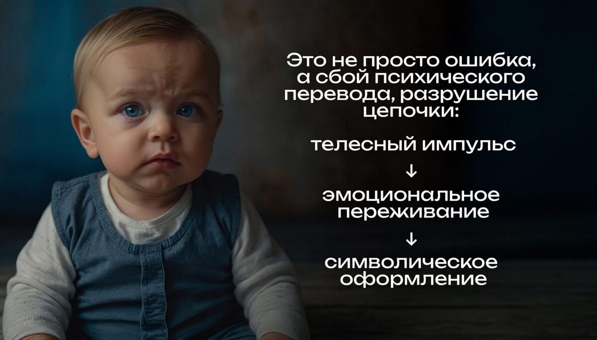 ✦ Нарушение ментализации: ребёнок не учится различать свои состояния. Влечение остаётся нерепрезентированным, «немым». Он не знает, что он чувствует, и не может это назвать.
