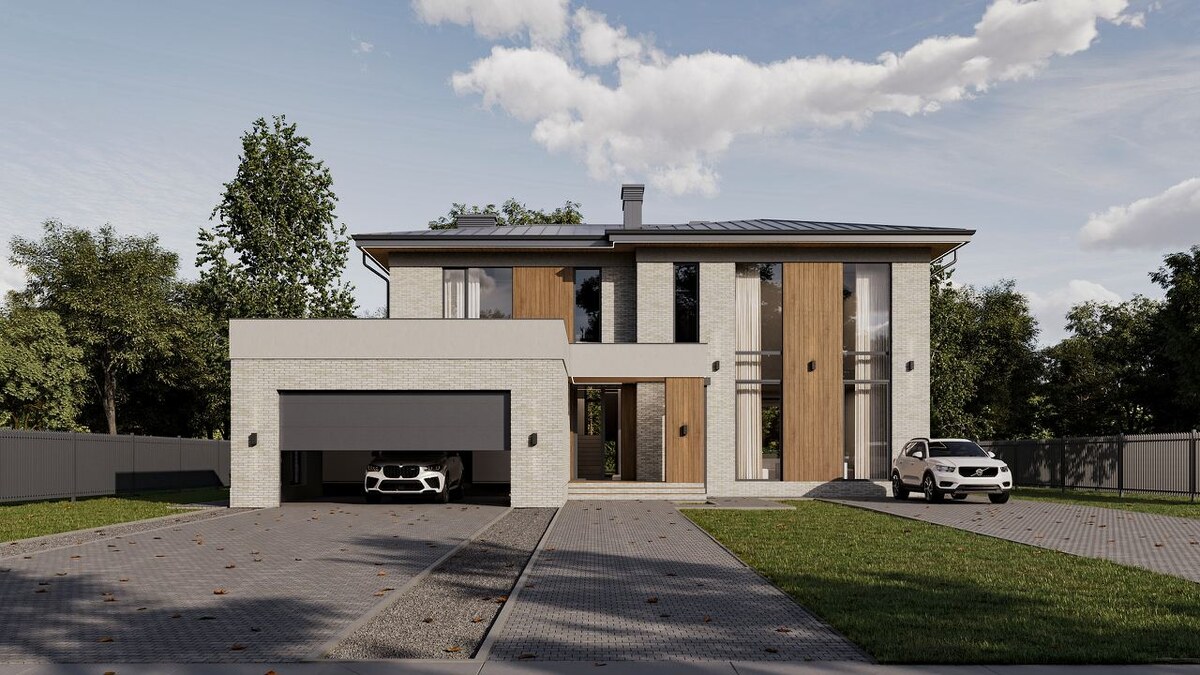 КЛМ 253 — 292,75 м² современной элегантности Уникальный двухэтажный дом с авторской архитектурой — гармония стиля, простора и технологий. Представьте дом, где каждая деталь создана для вдохновения. 292,75 м² интеллектуального пространства с эффектом второго света, панорамным остеклением и продуманной эргономикой. Это не просто жилье — это статус, комфорт и безупречный вкус. Первый этаж: пространство для жизни и впечатлений Вас встречает парадная прихожая с «парящей» лестницей и панорамным окном, создающими ощущение легкости и простора. Здесь же: - Гостевая спальня — уютное убежище для друзей или родных. - Современная котельная + постирочная — технологии, скрытые за эстетикой. - Сердце дома — кухня-гостиная с шестиметровыми окнами, заливающими пространство светом, и выходом на террасу. Представьте ужины у камина, воскресные завтраки с видом на сад или вечеринки, где гости перемещаются из гостиной на террасу, наслаждаясь природой. Второй этаж: приватность и роскошь - Две просторные д