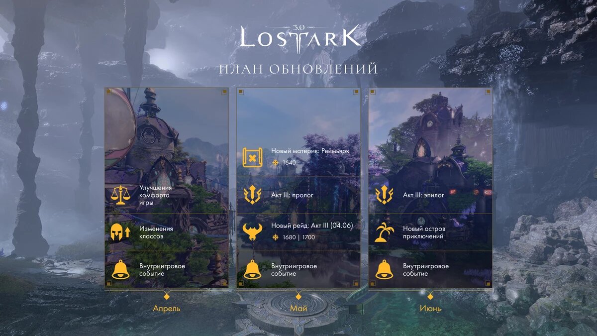 Издатель российской версии MMORPG Lost Ark опубликовал дорожную карту на ближайшие 3 месяца. Игроков ждет улучшение качества жизни, новый материк Реймьярк, новый рейд, новый остров приключений и прочие приятные обновления. Дорожная карта включает предварительные и наиболее значительные изменения, однако мы не исключаем возможности расширения или изменения списка планов в дальнейшем. Локализационные названия могут быть скорректированы в будущем. План обновлений подготовлен совместно со Smilegate RPG, разработчиком LOST ARK, и является общим видением того, в какой последовательности должны устанавливаться обновления. План может дополняться и претерпевать изменения, о которых сообщат отдельно.