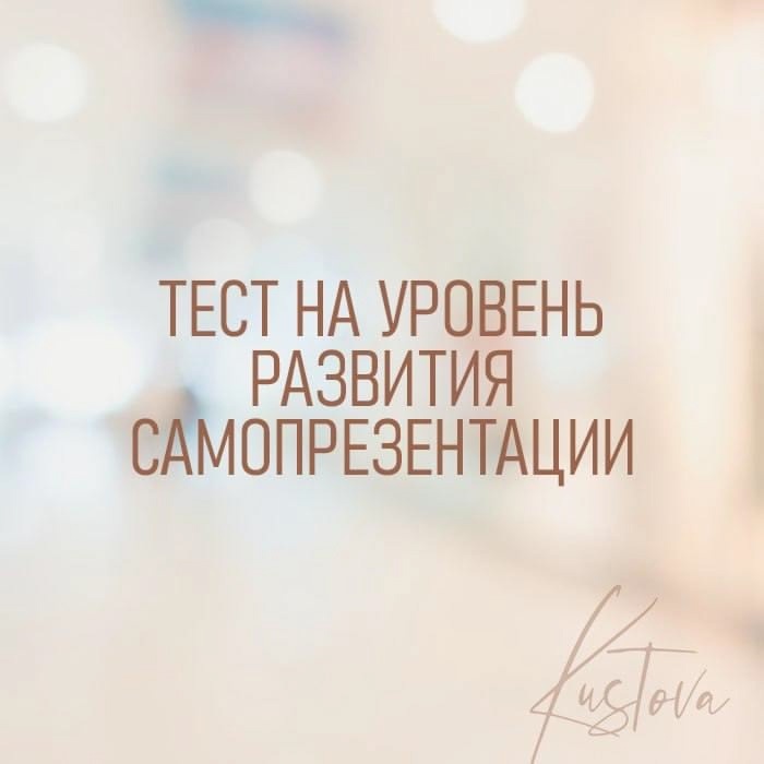 Предлагаю пройти тест и узнать свой уровень развития самопрезентации - то есть умения рассказывать о себе. Вас ждет всего 10 вопросов, а результаты теста будут после вопросов. Поделитесь итогами в комментариях! А сначала хочу представиться. Меня зовут Анна Кустова. Я эксперт в области вербальных и невербальных коммуникаций, тренер по имиджу в Top-600 Сбер Университета и автор системы «Код личности» и победительница премии “Главные женщины года 2024”. Уже 20 лет я изучаю, как стиль влияет на восприятие, и сегодня я хочу поделиться с вами тестом, который часто даю своим клиентам. 1. Как часто вы практикуетесь в самопрезентации? a) Ежедневно b) Несколько раз в неделю c) Редко d) Никогда 2. Какие методы вы используете для улучшения своей самопрезентации? a) Тренировки с друзьями или коллегами b) Обучение в специальных курсах c) Чтение литературы по теме d) Ничего не делаю 3. Какие качества вы считаете своими сильными сторонами? a) Хорошая коммуникабельность b) Лидерские качества c) Органи