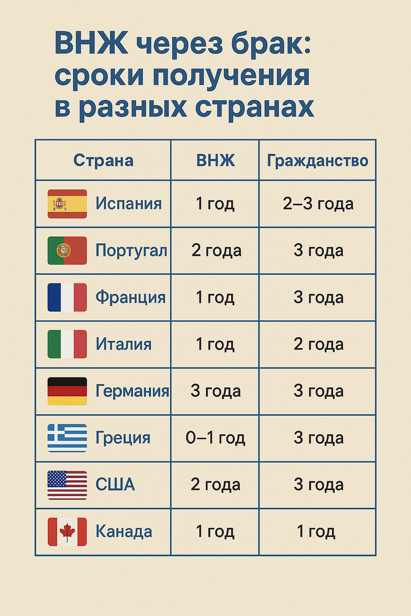 Эти страны также предоставляют ВНЖ через брак, но в них действуют более строгие правила: высокий уровень дохода супруга, языковые тесты, длительные сроки рассмотрения. Поэтому, если у вас нет уверенности в подаче, лучше выбрать страну с более понятными и прозрачными условиями.