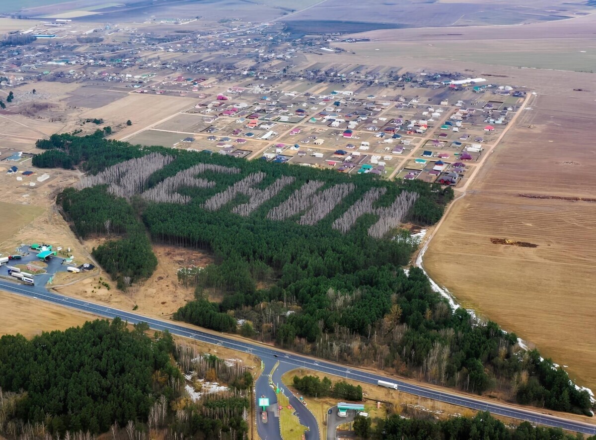 Технология описана так: фоном послужит массив из берёз, а сами символы — «9 Мая» — будут высажены деревьями сосны, которые должны контрастировать с белыми стволами берёз при взгляде сверху.