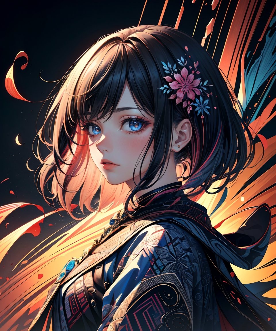 (лучшее качество, шедевр, официальное искусство, красиво и эстетично:1.2), 1девушка, ветер, чрезвычайно детализированный, (фрактальное искусство:1.2), красочный, (zentangle:1.2), красочный шум, реалистичный LUT, кинематографический LUT, <lora:more_details:0.4>,