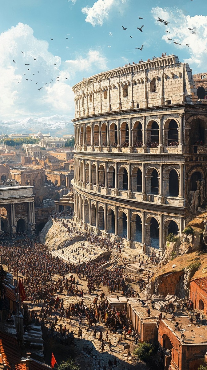 Создано на основе запроса: Ancient Roman Empire in its glory, vast classical civilization with magnificent architecture, imperial Roman cityscape with Colosseum and forums, powerful Mediterranean empire with legionnaires and Caesar, historical depiction of Rome at its height, classical antiquity's greatest empire