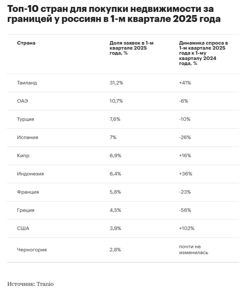• Однако граждане стали реже покупать недвижимость ради ВНЖ, общий спрос на зарубежную недвижимость среди россиян вырос на 16% за год, но снизился на 5,3% по сравнению с концом 2024 года.