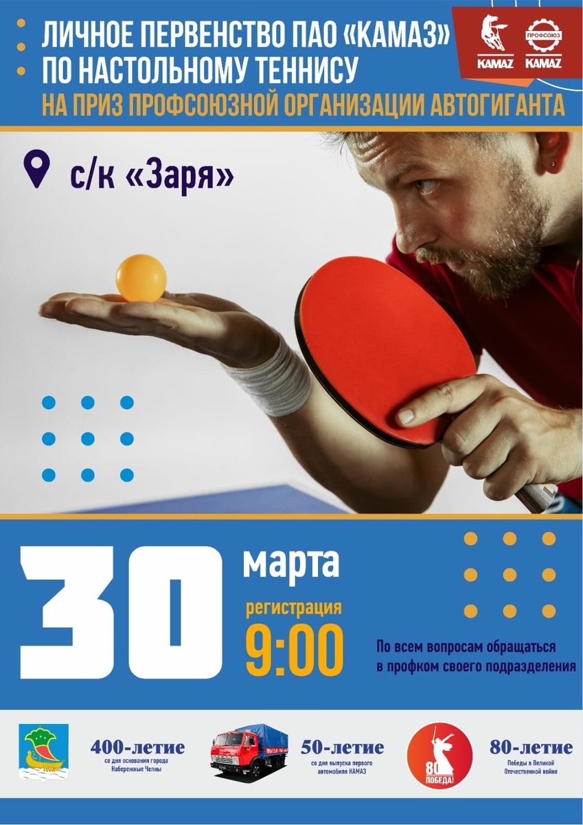 30 марта 2025 года в спортивном комплексе «Заря» состоится Личное первенство ПАО «КАМАЗ» по настольному теннису. Турнир, организованный профсоюзной организацией автогиганта, приурочен к трем значимым событиям: 80-летию Дня Победы в Великой Отечественной войне, 50-летию со дня выпуска первого автомобиля КАМАЗ и 400-летию со дня основания города Набережные Челны.