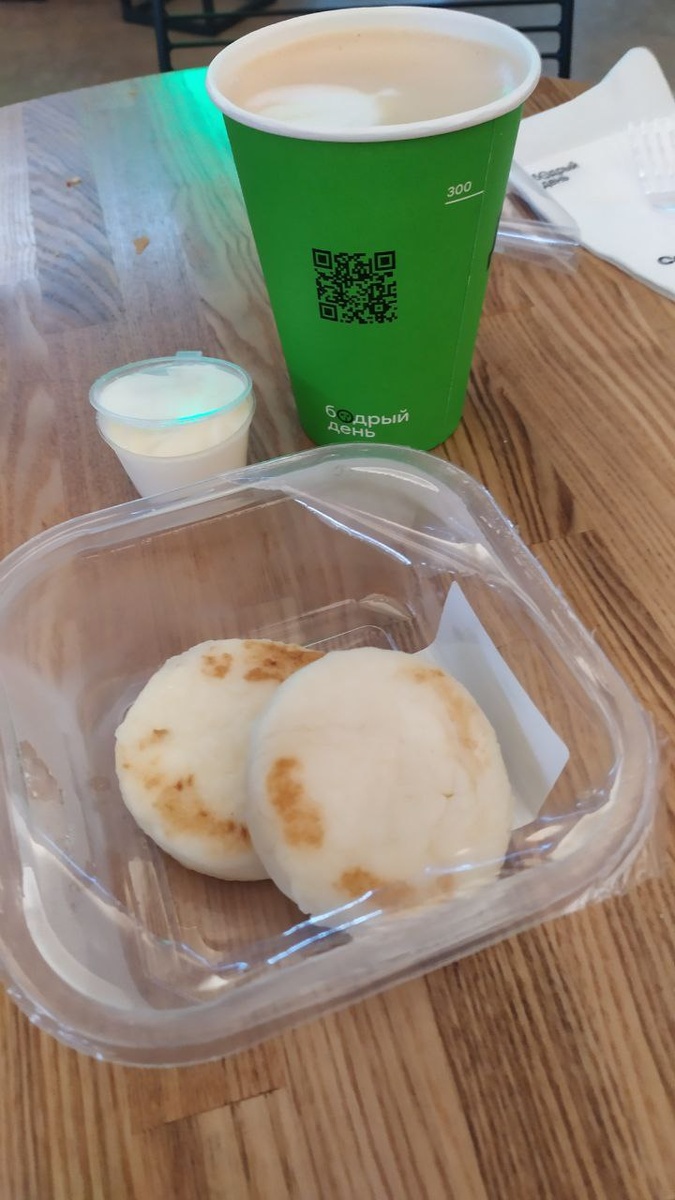 Я решила далеко не ходить, а позавтракать прямо там, взяв два сырника со сметаной и капучино.