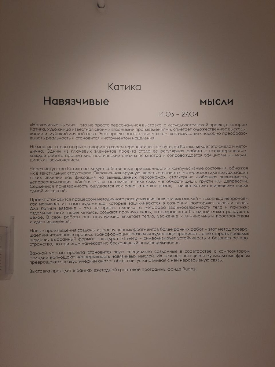 А в Ruarts Foundation идёт выставка "Навязчивые мысли" Это исследовательский проект Катики, художницы, известной своими вязанными произведениями. И он действительно исследовательский. У каждой работы не просто этикетка, а целое "дело". Работа рассматривается как отдельный пациент, прошла анализ психиатра, получила свой диагноз и даже официальное медицинское заключение! Это глубже, чем просто работы. Это целый разбор 🔥 📍 @ruartsfoundation, Трубниковский пер. 6 📅 до 27 апреля 💳 0-500 рублей #выставки
