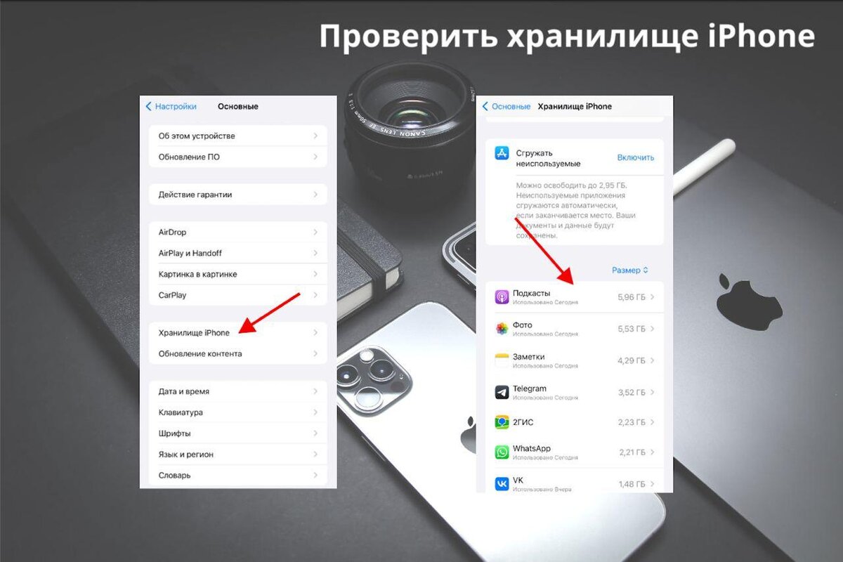 Память телефона переполнена Если память телефона заполнена, и вы не можете сделать фото, записать видео или телефон начал заметно притормаживать, попробуйте следующие шаги: Для начала почистите кэш Safari: - Перейти в Настройки – Safari – Очистить историю и данные – Подтвердить действия - Находясь в разделе Safari – Дополнения – Данные сайтов – Удалить все данные. Дальше можно оценить какие из приложений занимают больше всего места на телефоне и почистить их: Настройки – Основные – Хранилище iPhone – Внизу появится список приложений. Как правило, самые емкие приложения, это – Фото, Заметки, Telegram, Подкасты и др. ❗️Фото и Заметки – чистим в ручном режиме, чтобы не потерять нужные данные. Из приложения Подкасты и других аналогичных нужно периодически удалять загрузки: Настройки – Основные - Хранилище iPhone – Подкасты – Внизу будет список последних загрузок, которые можно удалить. Почистить кэш Telegram: Telegram - Настройки - Данные и память - Использование памяти - Очистить в