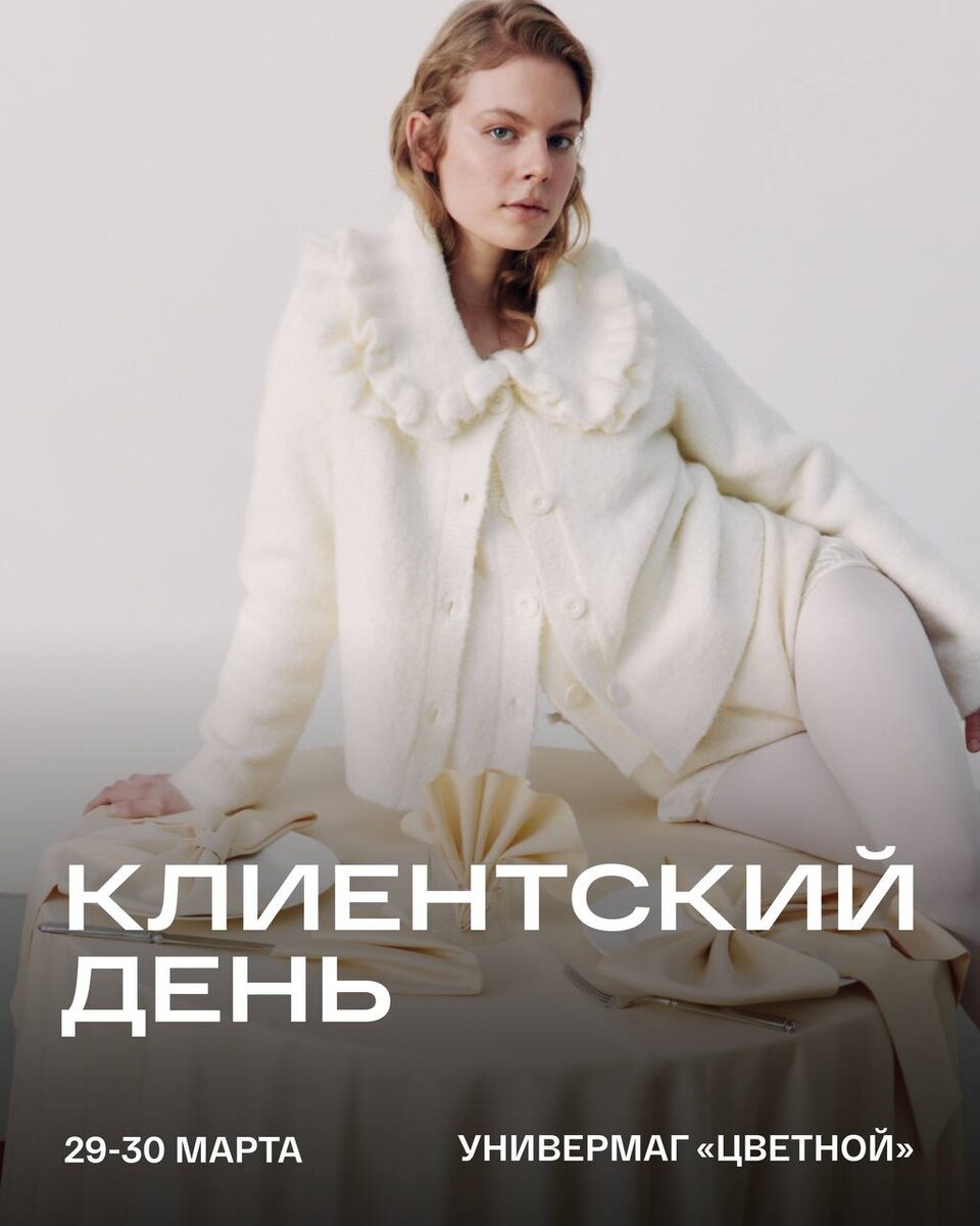 УЖЕ ЗАВТРА ✨ Клиентский день в Универмаге «Цветной» 29 и 30 марта с 10:00 до 22:00 приглашаем в наш корнер, где вас будут ждать фотозона, угощения и приятные сюрпризы. 🤍 Подарки от партнёров при любой покупке: Фитмост, Devichnik, EGGSELLENT, (RE)FOAM, Ekaterina Tolstaya Jewelry 🤍 При покупке от 10 000 рублей — дарим один из аксессуаров: резинки, носки, ремни, чехлы для ноутбука, косметички 🤍 При покупке от 20 000 рублей — кардиган в подарок 🤍 Скидка 10% и специальная упаковка для всех покупок в эти дни Ждём вас на 4 этаже Универмага «Цветной», по адресу Цветной бульвар, 15, стр. 1. Количество подарков ограничено.