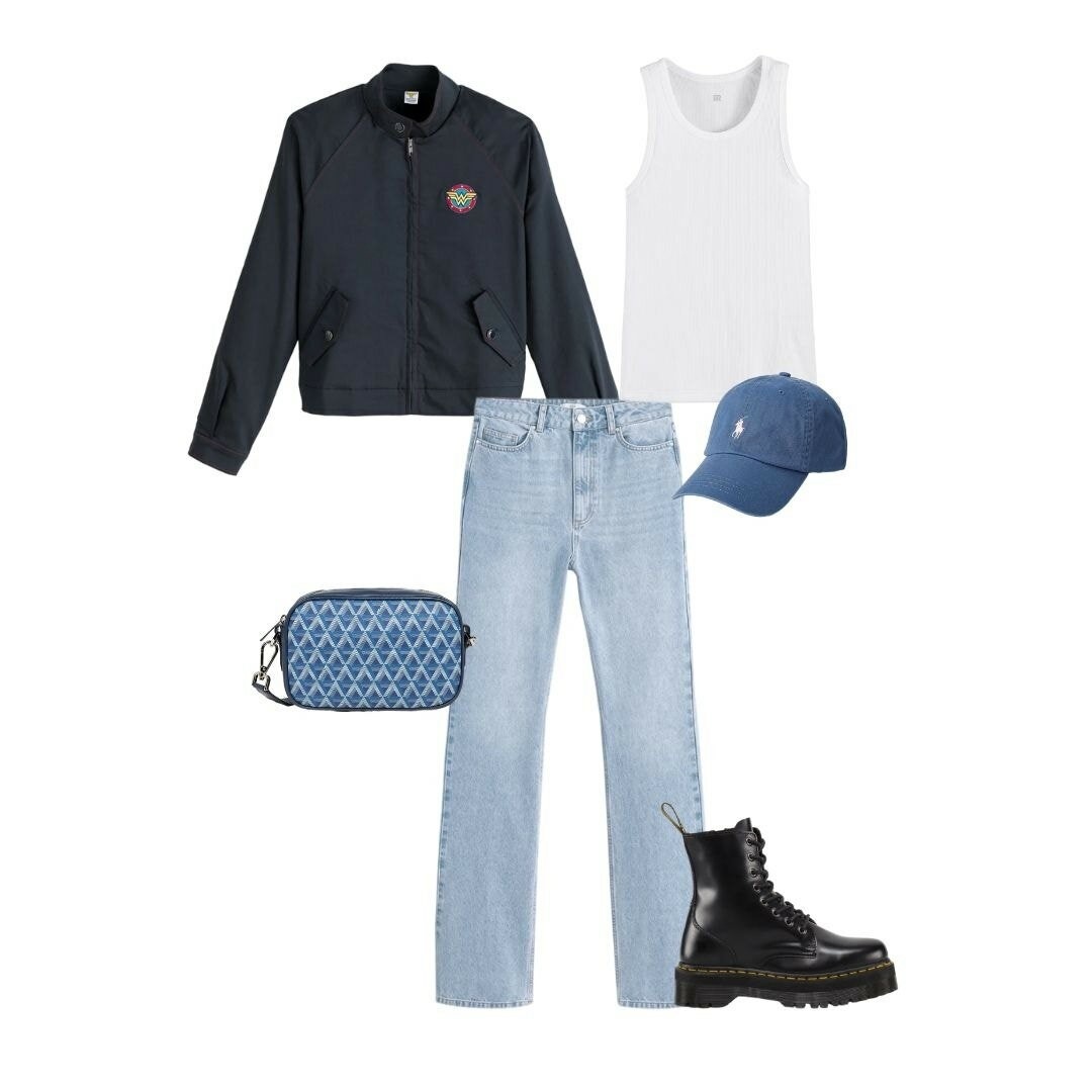 Бывают дни, когда совсем не хочется заморачиваться о том, что надеть: скорее всего мы накинем на себя первое, что выпадет из шкафа. Сложно назвать такой случайный образ стильным, поэтому страдает и наша уверенность в себе. Чтобы не бояться встретить знакомых, но при этом не тратить много времени на подбор образа, предлагаем познакомиться с идеями простых сочетаний одежды. В подобных нарядах вы точно будете чувствовать себя комфортно и уверенно! Джинсы – одна из самых базовых и простых вещей в гардеробе, которая сочетается абсолютно со всем. Благодаря этому мы носим джинсы чаще всего, и они уже стали самым комфортным вариантом низа. Добавляем к любимой паре вещи в стиле casual, например, белую майку, ботинки и спортивную куртку, и получаем универсальный образ! Куртка Майка Джинсы Бейсболка Ботинки Сумка Когда речь заходит о комфорте в одежде, мы подразумеваем свободу движений. Трикотажные вещи отлично подходят под это описание, так как они приятны к телу и не создают сковывающих ощущен