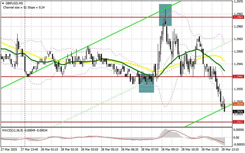 В своем утреннем прогнозе я обращал внимание на уровень 1.2964 и планировал от него принимать решения по входу в рынок. Давайте посмотрим на 5-минутный график и разберемся с тем, что там произошло. Рост и формирование ложного пробоя в районе 1.2964 привели к точке входа на продажу фунта, что вылилось в падение пары в район утренней поддержки 1.2940, от которой я покупал GBP/USD еще в самом начале европейской сессии. На вторую половину дня техническая картина была пересмотрена.