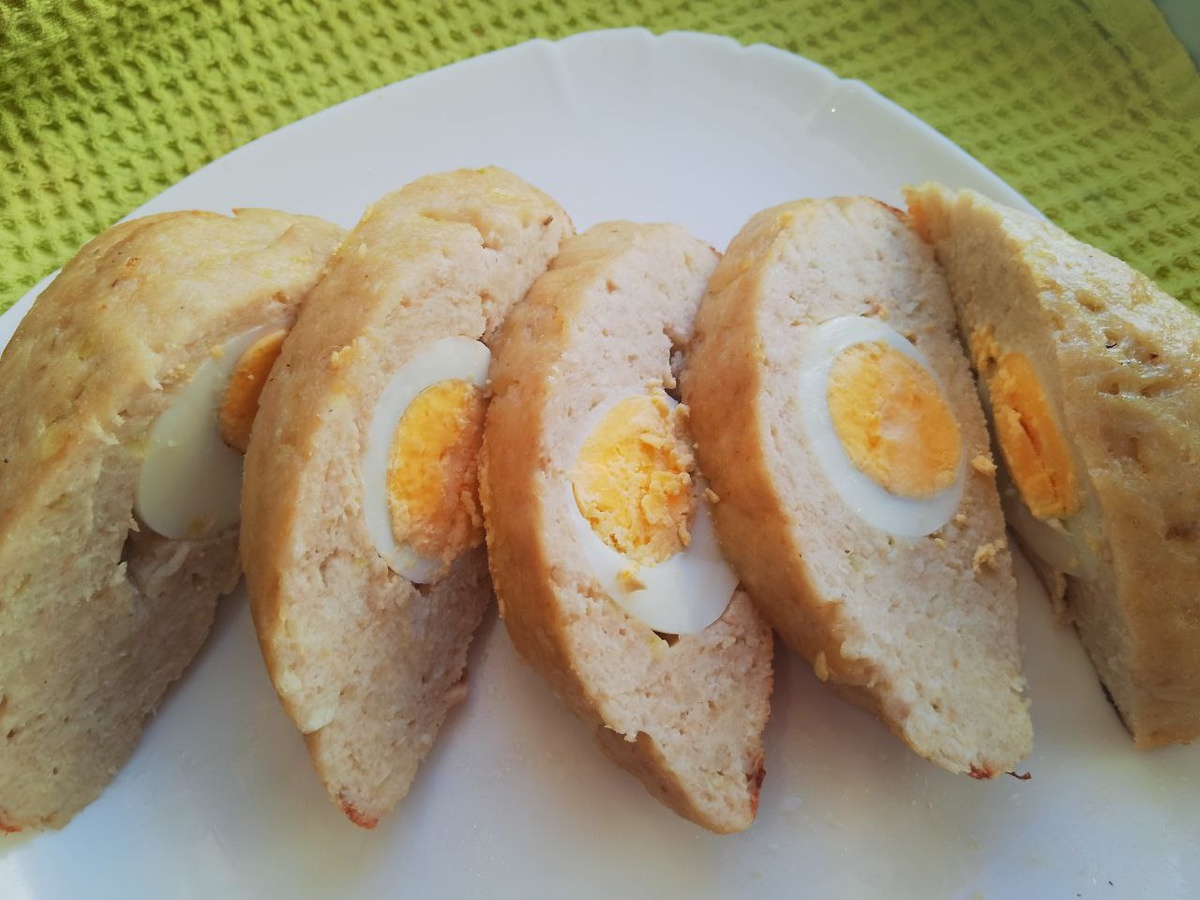 Удобно делать это в прямоугольной форме для хлеба. Застилаем его пергаментом, края которого должны свешиваться. Делим фарш на 2 равные части. Скатаем каждую половину в рулет, расплющим его и сделаем углубление для яиц.