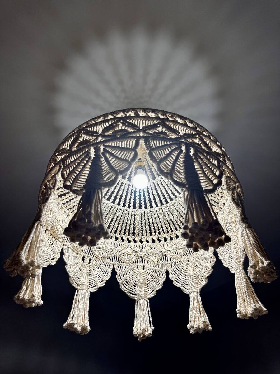 В одной спальне — абажур в технике макраме, имеющий имя Ефросинья, в другой — винтажная люстра, светившая иным не один десяток лет. В барной зоне светильники исполненные в виде языков колокола. Когда включены, будто добела раскалённый чугун. Над обеденным столом — невесомое сияние.