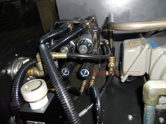 Регулировку давления производим с помощью предохранительного клапана, расположенного на гидростанции и отмеченного стрелкой: вращая по часовой стрелке, давление поднимается, против часовой стрелки - опускается. Показания давления смотрим на манометре CHUCK PRESSURE
