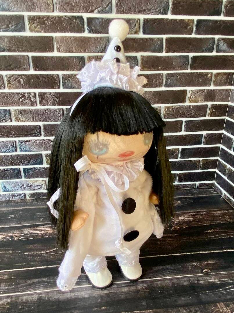 🎭 *Пьеро с грустными глазами — история одного трогательного создания* Его зовут Пьеро — и он не просто игрушка, а маленький хранитель тихих мечтаний. ### Его история: Когда-то он жил в старом кукольном театре, где лунный свет заменял ему лампы, а шелест занавеса был колыбельной. Но однажды он решил найти того, кому подарит свою нежную грусть — и попал в руки мастерицы Валентины. ### Его особенность: - Белый балахончик — сшит из облачной ткани (такой же мягкой, как первый снег) ❄️ - Длинные рукава — чтобы махать на прощание тем, кто уходит, и обнимать тех, кто остается 🤍 - Густые волосы из натурального материала — в них заплетены лунные блики (если присмотреться, можно найти) 🌙 - Грустные глаза — но это не печаль, а тихая мудрость того, кто понимает: любовь бывает разной ### Почему он ищет дом? Потому что **каждому Пьеро нужен друг, который: - иногда грустит по звёздам, - верит в сказки, даже взрослея, - оставляет на подоконнике кусочек хлеба для лунных зайцев. Он уже ждёт вас в