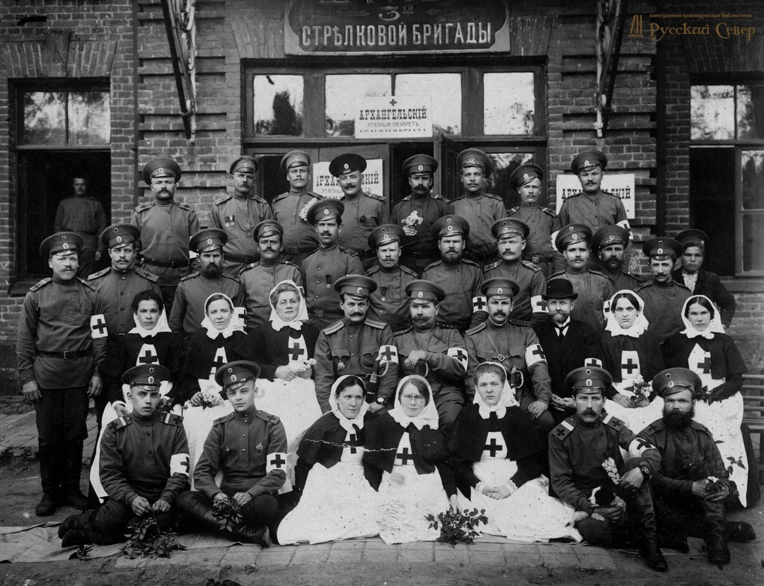 Архангельский этапный лазарет. 1914 год. Когда Германия объявила войну Российской Империи, началась мобилизация, царь обратился к народу с манифестом, началась активная мобилизация, в это время шло формирование этапного лазарета Архангельского управления общества Красного Креста для отправки на место военных действий.