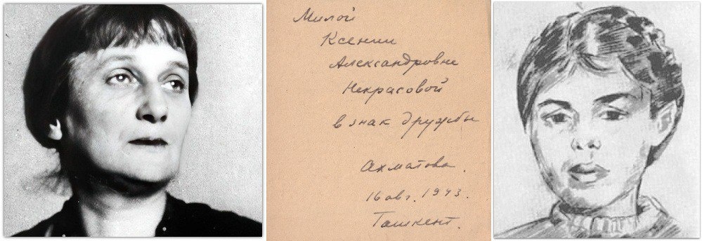 Одна из них пришла к Ахматовой во время войны в Ташкенте. "Поэтесса Некрасова. Муж сошел с ума, сын умер, сама полусумасшедшая. Открыла грудь перед Ахматовой: "У меня нет насекомых",– записал в дневнике Валентин Берестов 31 апреля 1943 года, а позже вспоминал: «Это рассказала мне Надежда Яковлевна [Мандельштам]. Сумасшедшего мужа она домыслила для полноты образа. Мне было понятно, почему Ксения Некрасова, приехав в Ташкент из своего горного кишлака, куда ее, москвичку, загнала военная судьба, поселилась прямо у Ахматовой в ее узенькой комнатушке. У Ксении не было семьи. Своею семьей она считала хороших поэтов: чем лучше поэт, тем он для нее роднее. Вот и пришла к Ахматовой, как к родственнице. Опекавшие Ахматову дамы (они получили прозвище "жен-мироносиц") советовали Анне Андреевне прогнать Ксению. Подробнее