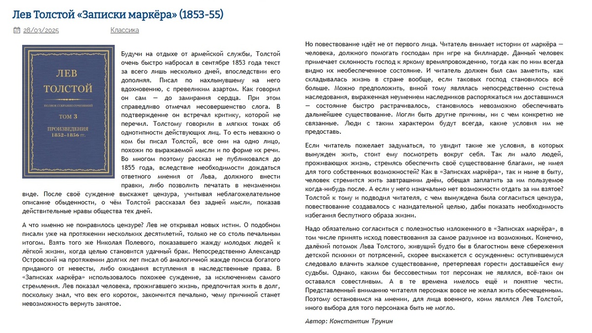 Лев Толстой "Записки маркёра" (1853-55) | Критика