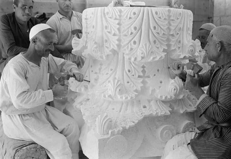 Фото-1. Каменщики вырезают новую капитель во время реконструкции Храмовой горы, Иерусалим, 1943 год
