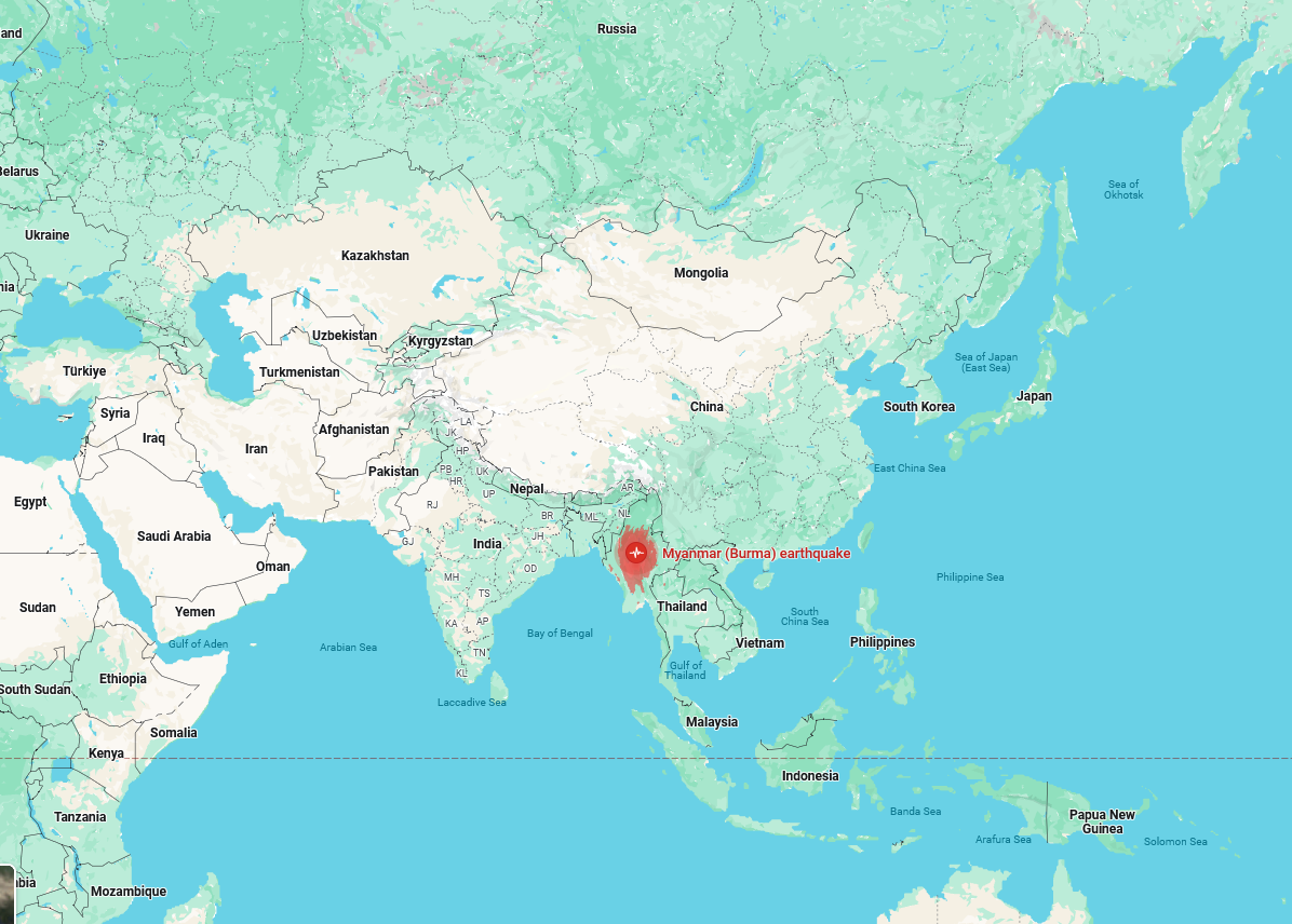 В день 28 марта 2025 года в государстве Мьянма (бирм.: မြန်မာ ), старое название – Бирма, произошла серия сильных землетрясений. Первый толчок силой почти 8 баллов (7.7) произошёл в 12:50 по местному времени. Источник залегал на глубине 10 км, на расстоянии примерно 33 км на юго-запад от города Мандалай. Второй толчок имел магнитуду 6.4 балла. В Мьянме обрушилось множество зданий, разрушился мост длиной более 1 км через реку Иравади. Отголоски землетрясения чувствовались в соседних странах – Вьетнам, Таиланд, КНР. В городе Бангкок – столице государства Таиланд (тайск.: ประเทศไทย) – рухнуло строящееся высотное здание. Несколько десятков человек оказались погребены под завалами. Премьер-министр Таиланда – Пхетхонгтхан Чинават – объявила в Бангкоке чрезвычайное положение. По предварительным данным, при землетрясении в Мьянме погибли более 1600 человек, более сотни человек числятся без вести пропавшими, количество раненных превышает 3000 человек. Серия землетрясений была такой силы, что