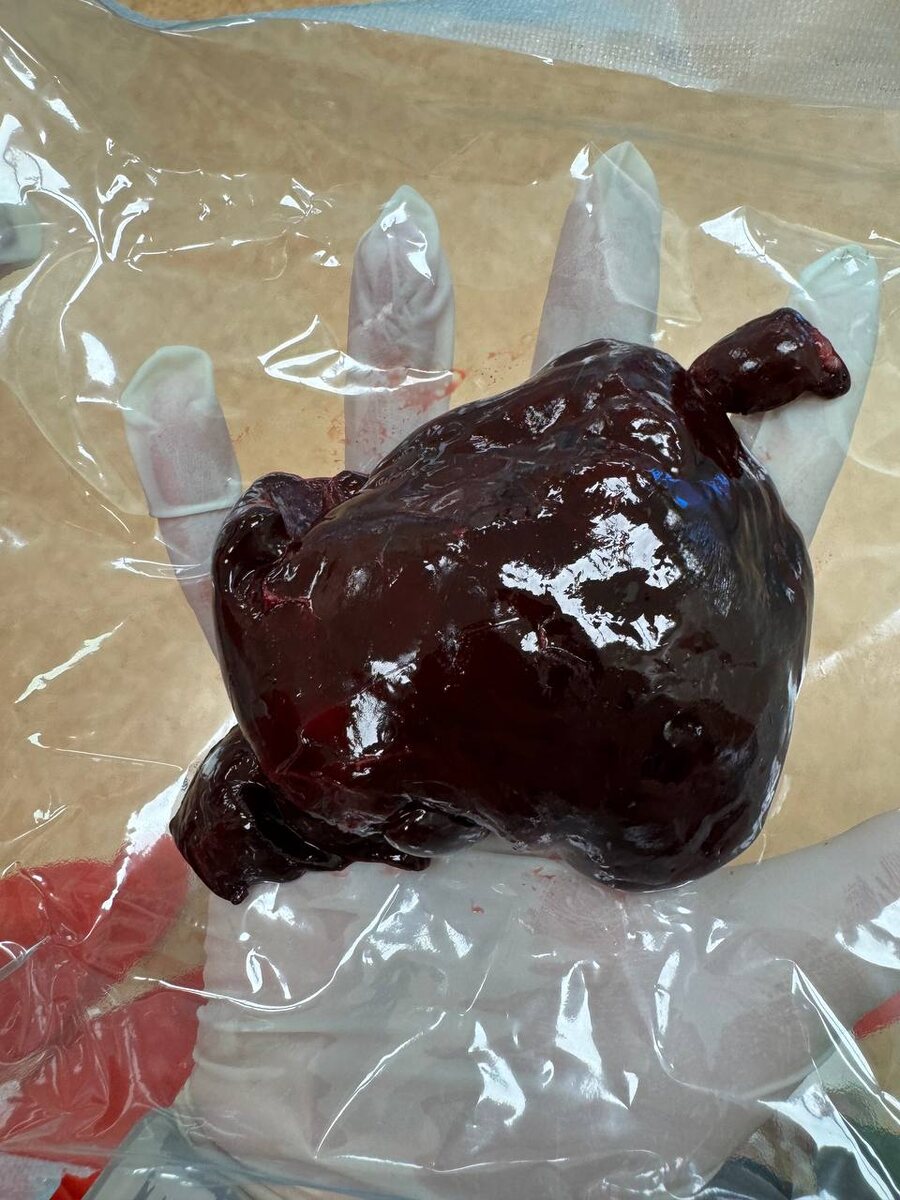 Вслед за рождением плаценты в ране показался вот такой сгусток крови (на фото).