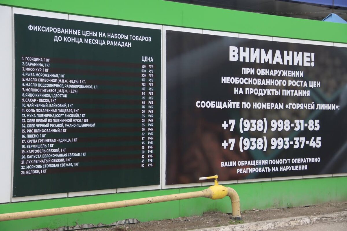 На центральном рынке «Беркат» в Грозном установили щиты с фиксированными ценами для предотвращения повышения стоимости на товары в месяц Рамадан. Напомним, ранее Глава Чеченской Республики Рамзан Кадыров поручил установить щиты на крупных региональных рынках. Такое поручение он дал в ходе расширенного совещания Правительства ЧР. На стендах расписаны основные продукты с фиксированными ценами, также указаны номера «горячей линии», по которым граждане смогут обратиться при обнаружении необоснованного роста цен. Жители Грозного рады такой инициативе, ведь в преддверии Ид аль-Фитра люди закупаются продуктами для праздничного стола, и хочется, чтобы цены были приемлемыми.