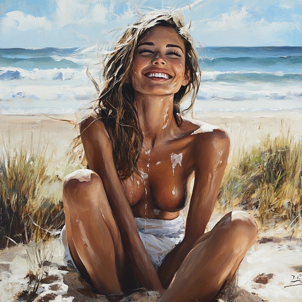 Создано на основе запроса: Imagine a sunny day at a beautiful beach. A joyful woman sits relaxed in the warm sand, her hair gently tousled by the wind, and the sound of waves crashing in the background. Her smile radiates pure happiness and freedom as she breathes deeply, embracing the peaceful atmosphere around her. Her eyes are filled with contentment, and she feels perfectly in tune with nature. As she enjoys a sweet treat, a sticky white syrup playfully drips down her face, creating a fun and carefree moment. The golden sand beneath her and the vast ocean in front of her create a perfect backdrop for this tranquil scene of joy and spontaneity --- Автоперевод: Представьте себе солнечный день на прекрасном пляже. Как тебе такая генерация? 🤔 https://dzen.ru/id/65c0c65c86e4f837c27b24d7 #ИИ #AI #нейросеть #midjourney #art