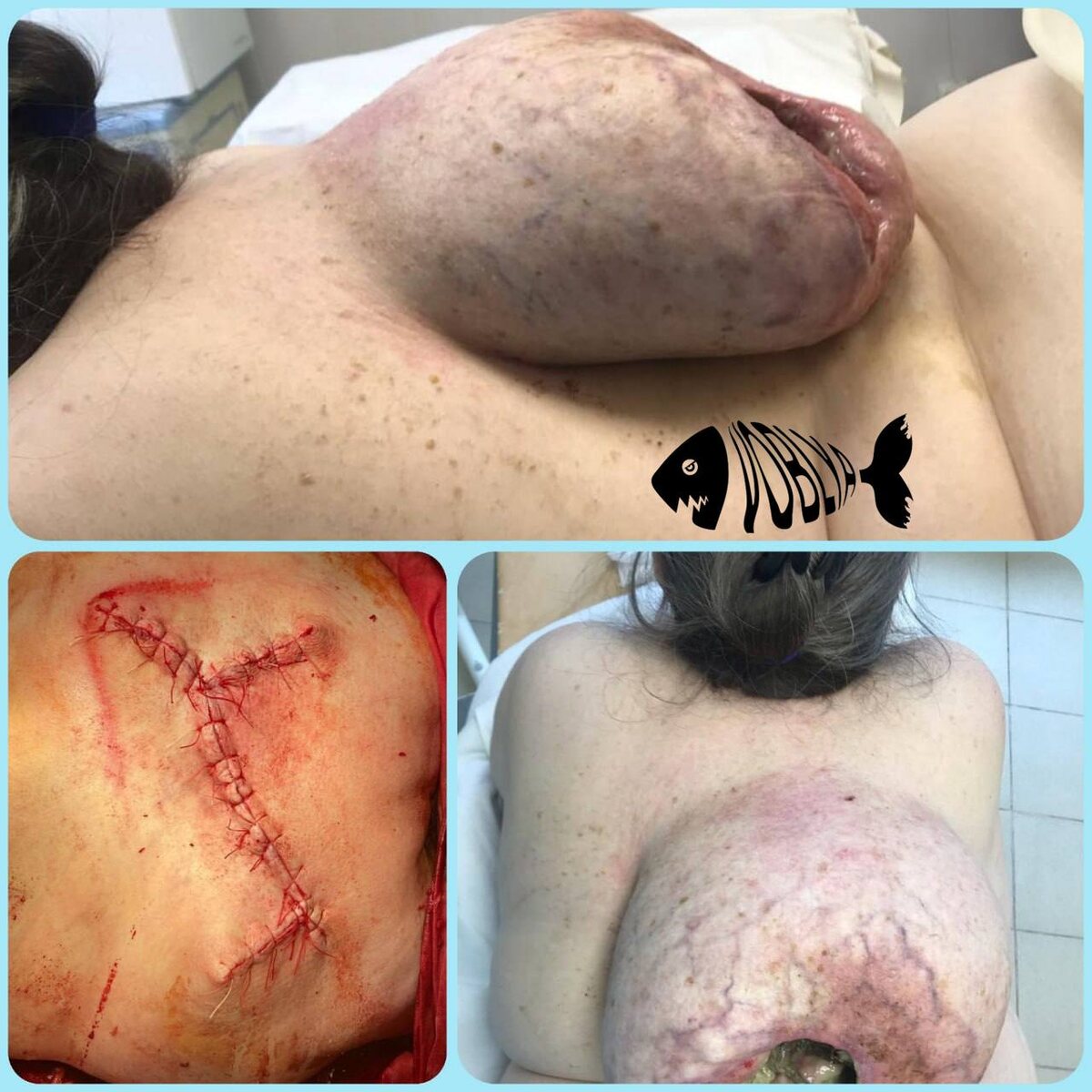 Пациентка обратилась к врачам, когда липома начала отмирать, а запах разлагающегося мяса стал невыносимым. Медики удалили огромную шишку, а следы от порезов аккуратно зашили с помощью пластической хирургии.
