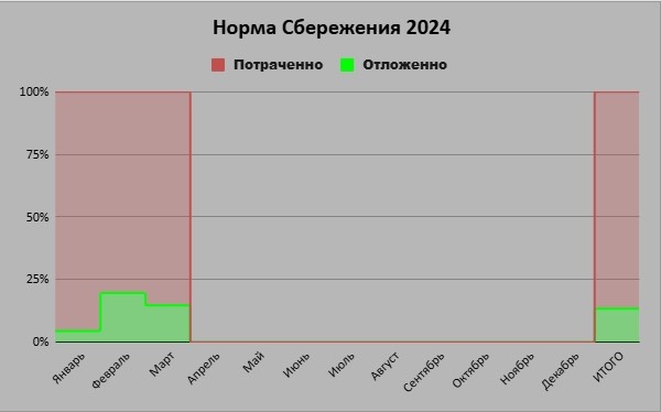 Всех приветствую, Прошел очередной месяц и пора подводить итоги. За март норма сбережения составила - 14,5%. Для полноты картины отпуск в Калининград отсутствует в расходах марта. Причина проста на эту поездку были отложены деньги с выплаченных мне при увольнении. Тогда я их в доход не ставил, соответственно сейчас не ставлю их в расходы. В феврале норма сбережения составила 19% Ну а год назад в марте 2024го норма сбережения была - 54% Ну а теперь к расходам. ТО, шиномонтаж и мелкий ремонт подвески. Тут нет расходов на поездку в Калининграде. В остальном обычные наши расходы в этой категории. Тут все стандартно 27700 платеж, остальное в досрочку для так сказать ровного счета. Очень редкая для меня категория, но вот случилась Тут в основном расходы на подарки на работе. Подарки личные покупали ещё в феврале. Ну я еще завел себе ТГ канал, зачем не знаю может быть потом придумаю что с ним делать.