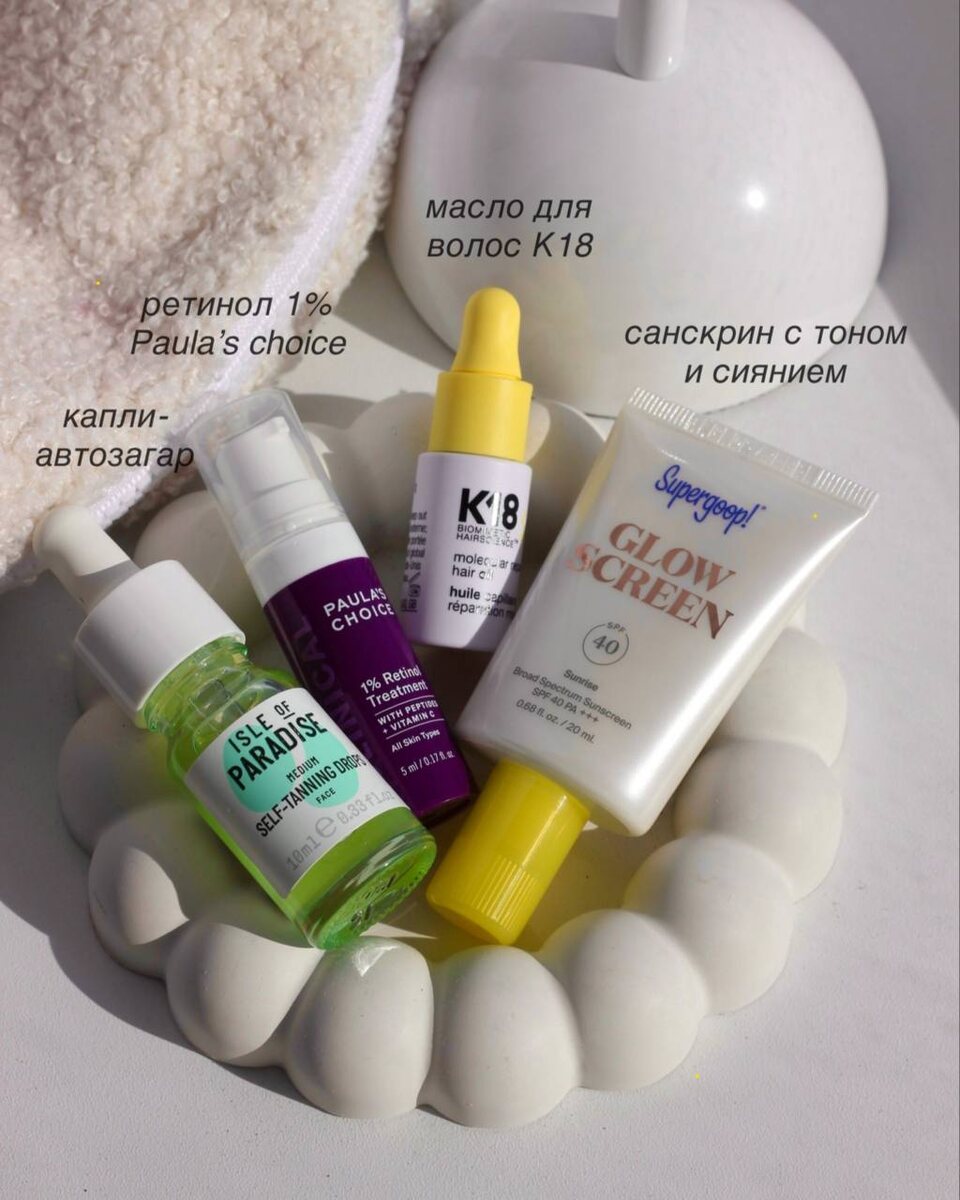 Тут солнцезащитный крем от Supergoop! Он с тоном и сиянием. Масло для волос от К18. Тот самый ретинол 1% от Полы и капли-автозагар от Isle of Paradise. Их взяла на замену Кларанс. Почему-то Кларанс со временем перестают на мне работать. У меня одной так?